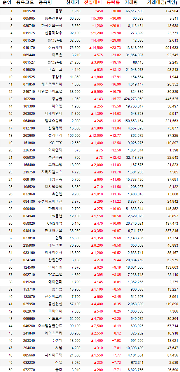 동부건설우 +30.00%(1만5300원) 6만6300원 4. 동양3우B +29.88%(1만4400원) 6만2600원 5. 한국정보과학 +29.91%(1280원) 5560원 ◇ 오늘의 급등 종목 +15% 이상 상승 종목들 코스피 1. 신풍제약 +23.73%(1만4500원) 7만5600원 2. 동양2우B +19.16%(3900원) 2만4250원 3. 이스타코...