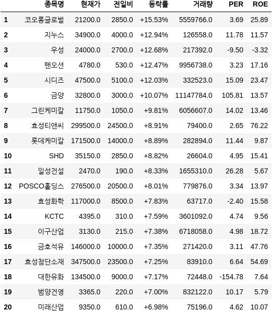 SHD도 21.95%(9800원) 떨어진 3만4850원에 장을 마쳤다. SHD는 전기주석, 착색 및 도금 강판 제조업체다. 특별한 악재나 공시는 없었다. 진에어도 17.53%(2550원) 내린 1만2000원에 마감했다. 코로나19 이후에도 여객 수요가 크게 수혜를 보지 않을 것이란 증권가 전망에 하락한 것으로 풀이된다....