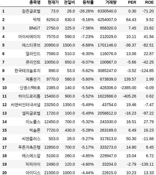 오늘(2일) 참존글로벌은 코스닥시장에서 전 거래일 대비 77원(35.81%) 급락한 138원에 거래를 끝냈습니다. 에스디생명공학은 코스닥시장에서 전거래일 대비 615원(26.62%) 급락한 1천695원에 거래를 마감했습니다. 레드로버는 코스닥시장에서 전 거래일 대비 12원(25.00%) 급락한 36원에...